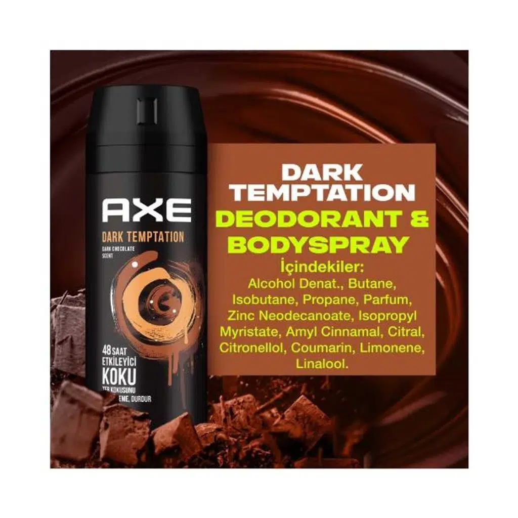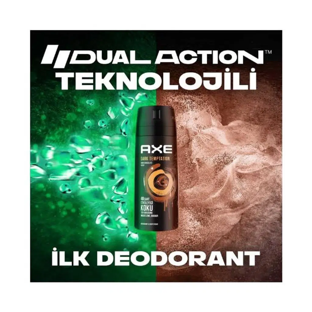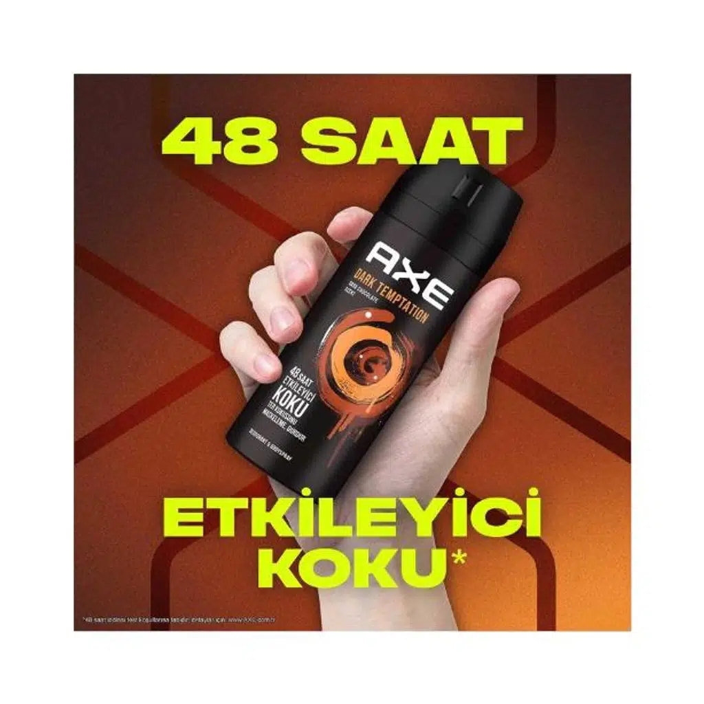 Bitter çikolatanın cezbedici kokusunu taşıyan Axe Dark Temptation, Dual Action teknolojisi ile ter kokusunu durdurur ve 48 saate kadar etkili ferahlık sağlar. Çekici ve yoğun aromasıyla fark edilmenizi kolaylaştırır, tüm vücuda uygulanabilir formülüyle gün boyu etkileyici bir koku deneyimi sunar.