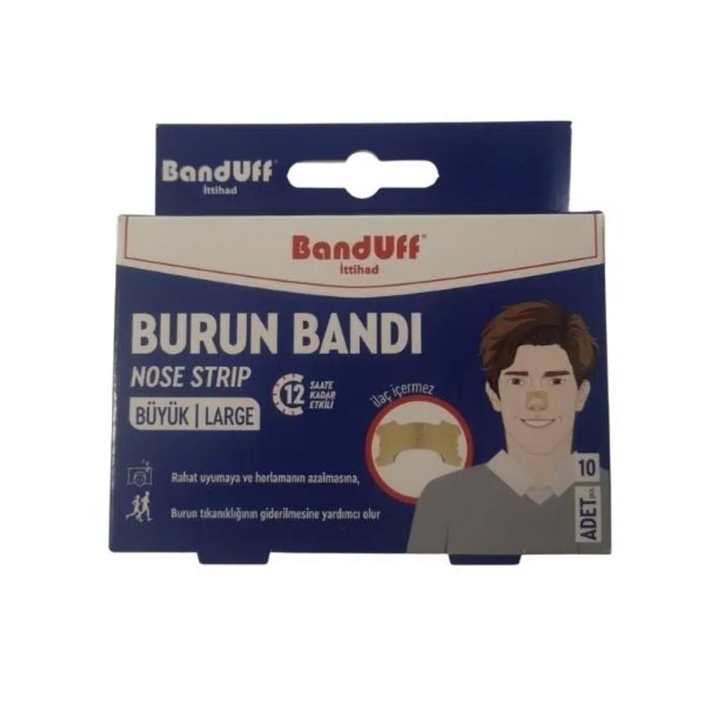 Banduff Burun Bandı, burun kanatlarını hafifçe yukarı kaldırarak burun pasajlarını genişletmeye yardımcı olan anatomik yapıda bir üründür. Özellikle gece boyunca burun tıkanıklığını azaltmaya, daha rahat nefes almayı sağlamaya ve horlamayı azaltmaya yönelik geliştirilmiştir. Spor yaparken, uyurken ya da alerji ve soğuk algınlığı durumlarında kullanılabilir. Büyük boy tasarımı geniş burun yapısına sahip bireyler için uygundur.