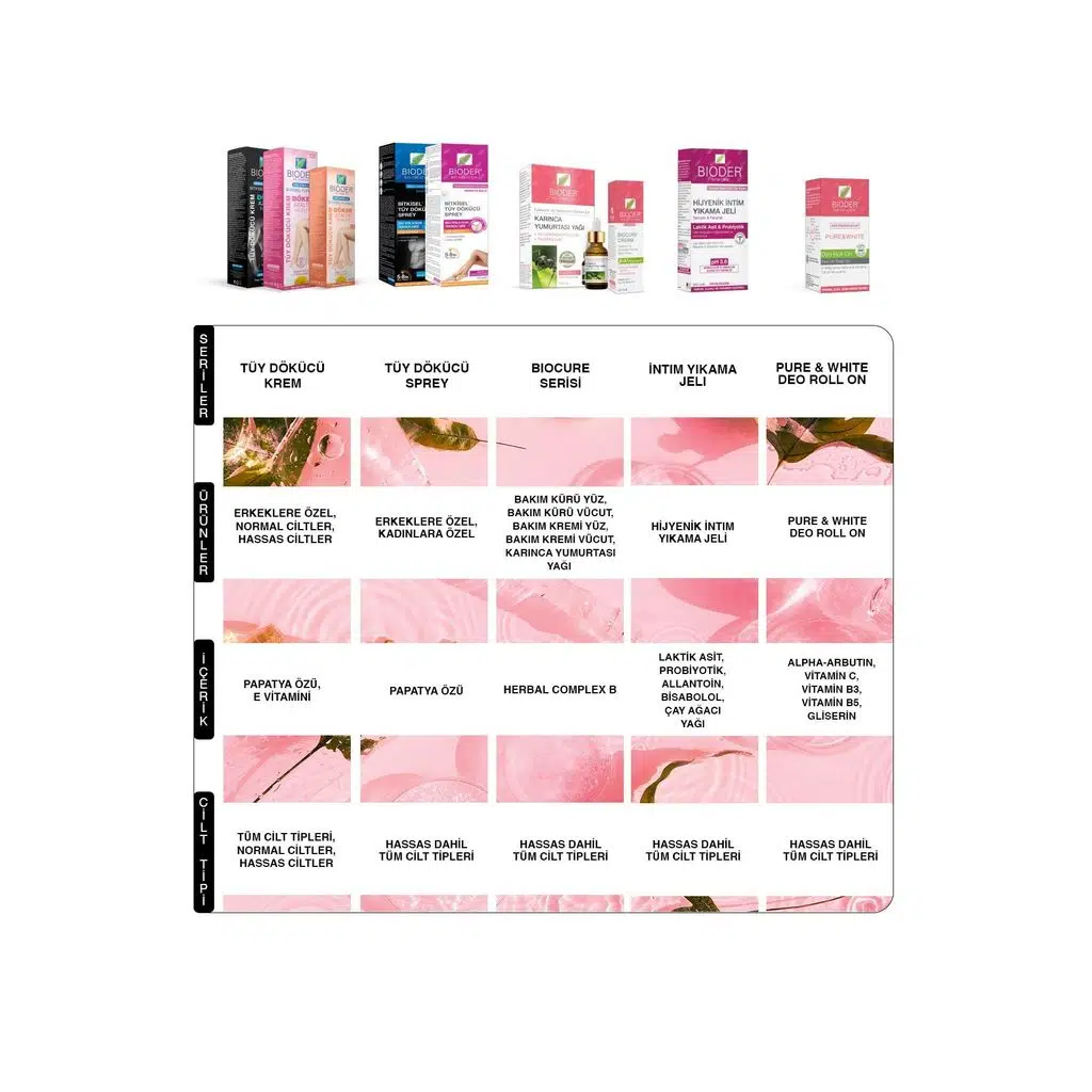 Bioder Bitkisel* Tüy Dökücü Sprey kısa tüylere bile etki eder. Böylece uzun süren pürüzsüzlük yaratır. Bacak arkası gibi ulaşılması zor alanlardaki tüylerden kurtulmanızı sağlar. İçerisinde bulunan bitkisel ekstre ile tüyleri döker, cildi arındırır ve nemlendirir.