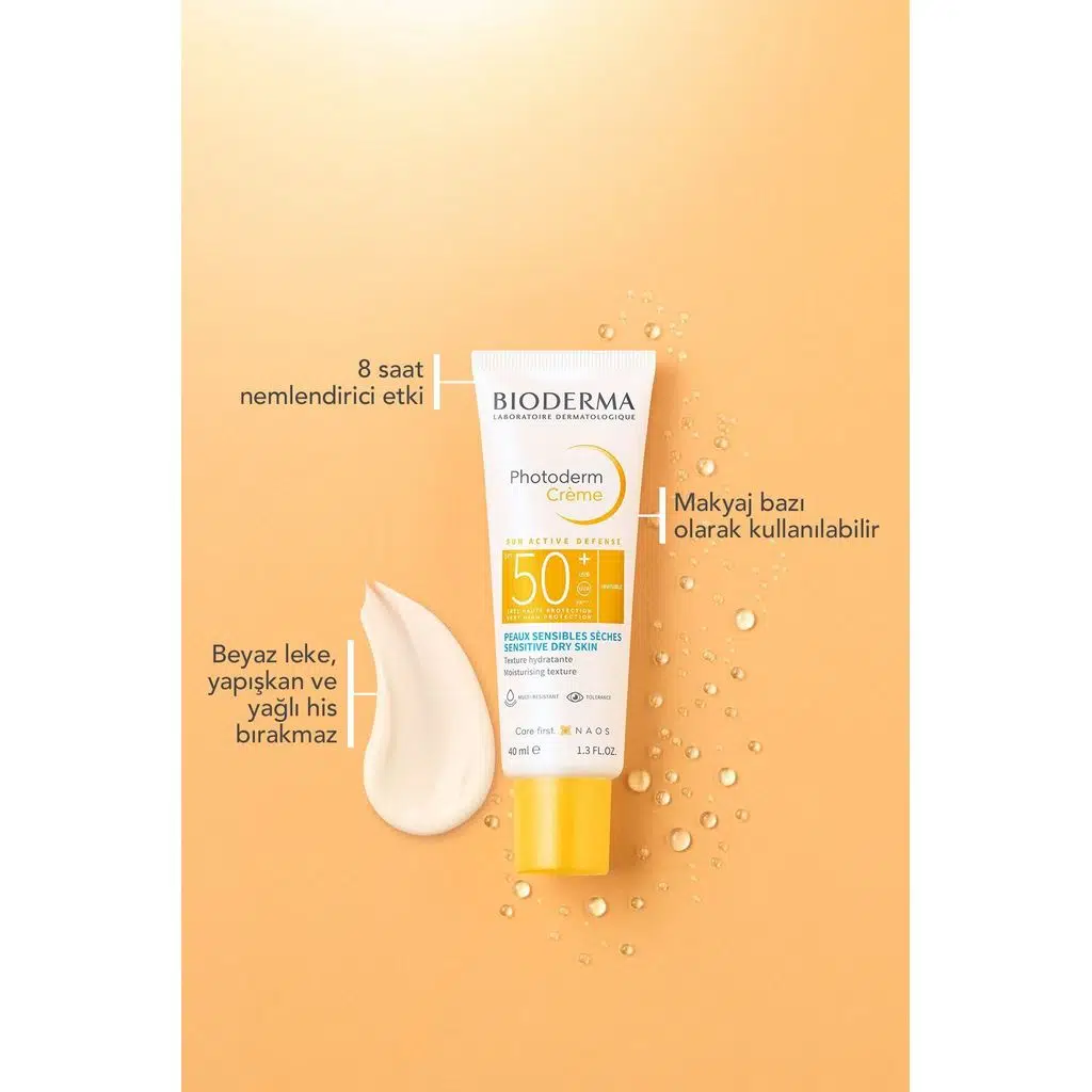 Bioderma Photoderm Cream SPF50+, kuru ve çok kuru ciltler için özel olarak formüle edilmiş, yüksek koruma sağlayan güneş kremidir. Sun Active Defense™ teknolojisi sayesinde UVA ve UVB ışınlarına karşı güçlendirilmiş içerik sunar, cildi derinlemesine nemlendirirken güneşin zararlı etkilerine karşı koruma sağlar. Mükemmel bir makyaj bazıdır, beyaz iz bırakmaz ve yağlı his oluşturmaz.