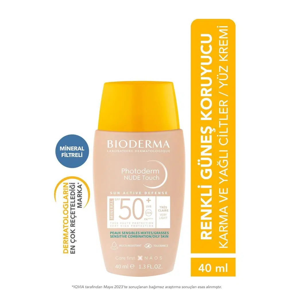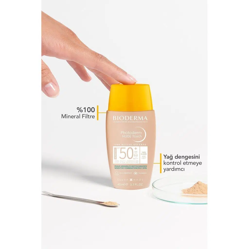 Bioderma Photoderm Nude Touch SPF50+, Sun Active Defense™ teknolojisi ile UVA/UVB ışınlarına karşı çok yüksek koruma sunar. Yağ içermeyen ultra hafif renkli formülü sayesinde cilt tonunu eşitler, 8 saat boyunca matlaştırıcı etki sağlar ve cildin yağ dengesini kontrol etmeye yardımcı olur.