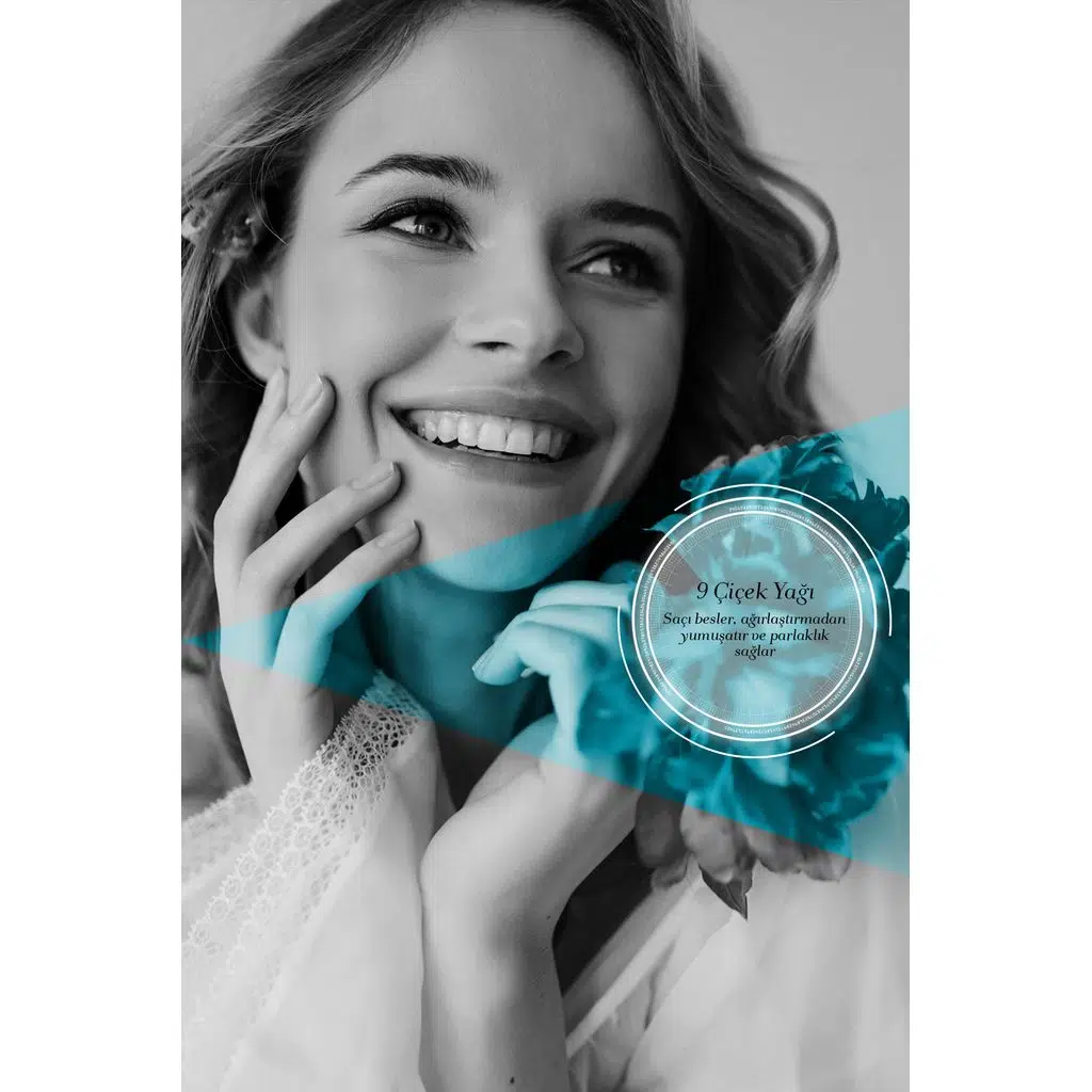 İçeriğindeki 9 çiçek yağı sayesinde saç tellerine ipeksi yumuşaklık kazandırır ve sağlıklı bir parlaklık sunar.