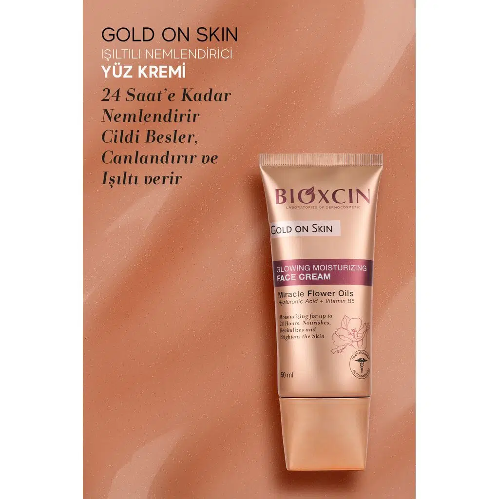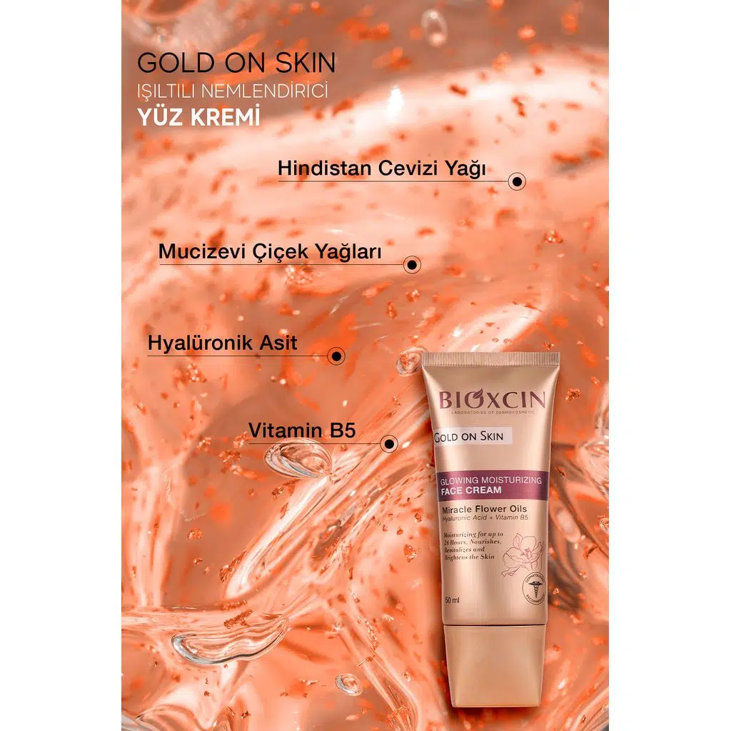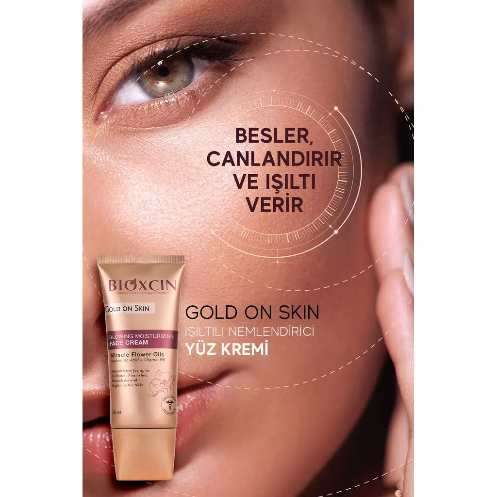 Bioxcin Gold On Skin Işıltılı Yüz Kremi, cilde hem yoğun nem hem de doğal bir ışıltı kazandırmak üzere geliştirilmiş özel bir bakım kremidir.