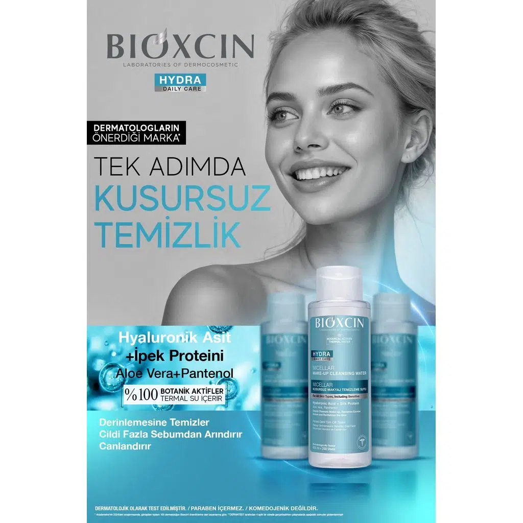 Bioxcin Hydra Micellar Kusursuz Makyaj Temizleme Suyu, hassas dahil tüm cilt tipleri için günlük kullanıma uygun olarak geliştirilmiştir. Bu ürün, dayanıklı makyaj da dahil olmak üzere ciltteki makyajı, kir ve fazla sebumu tek adımda derinlemesine temizler. Cildin doğal nem dengesini koruyarak ferahlatır ve canlandırır. Cildi kurutmaz, nazikçe temizler.