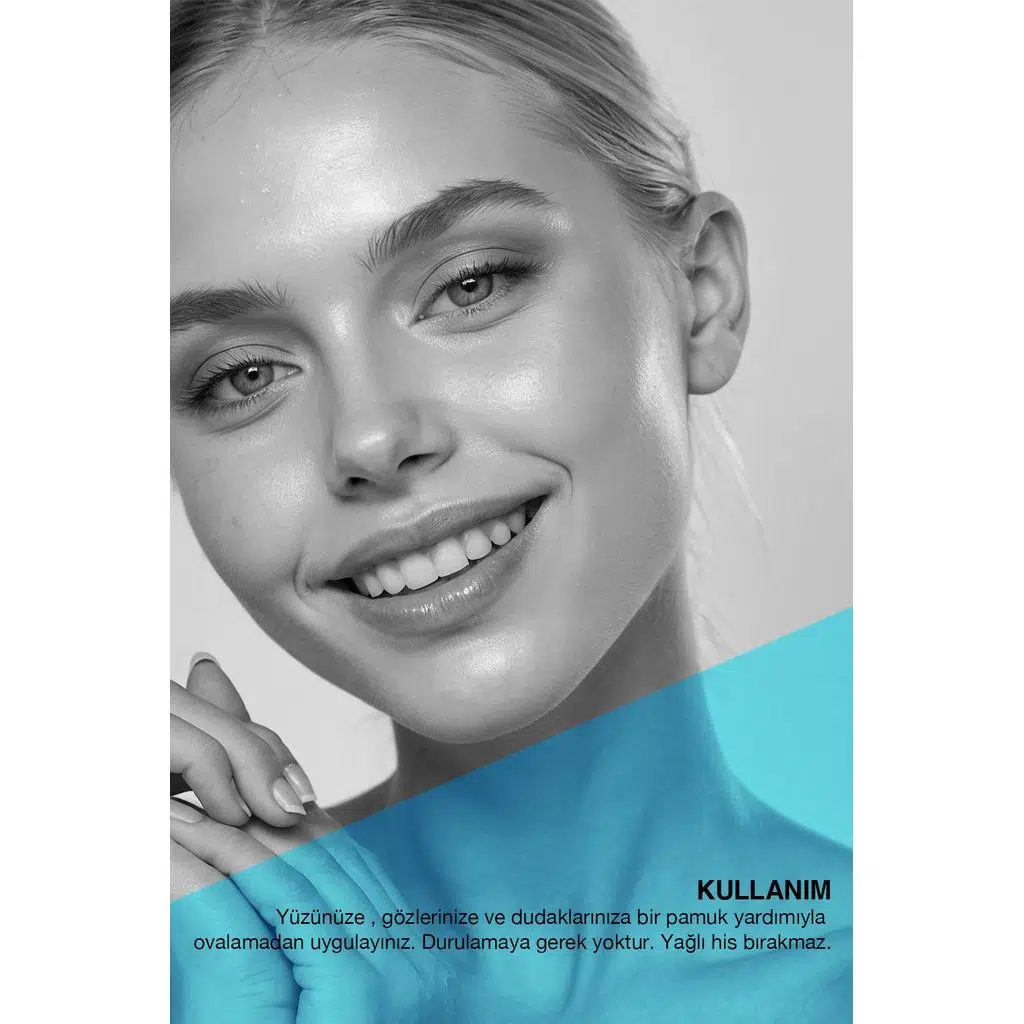 Yüzünüze, gözlerinize ve dudaklarınıza bir pamuk yardımıyla ovalamadan uygulayın. Durulama gerektirmez. Ürün yağlı bir his bırakmaz, ferahlatıcı ve temiz bir his sağlar.