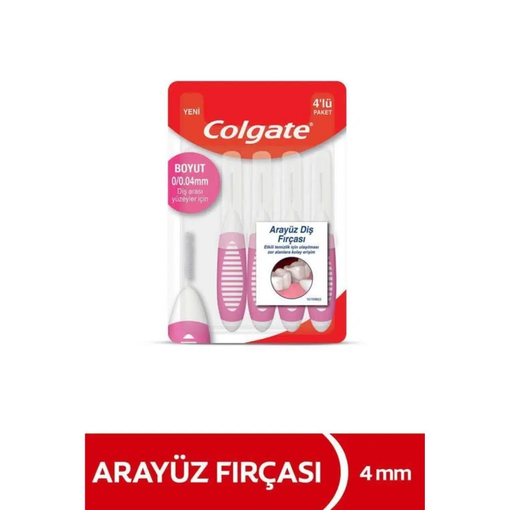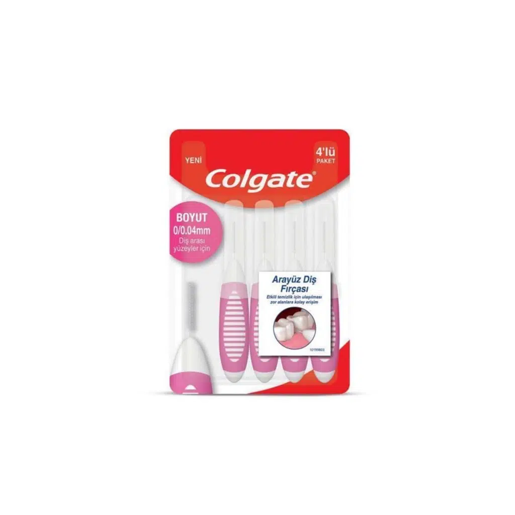 Colgate Arayüz Diş Fırçası 0/0.04 mm 4’lü, dişlerin arasında kalan ve normal diş fırçasıyla ulaşılamayan bölgeleri etkili şekilde temizlemek için geliştirilmiş özel bir arayüz fırçasıdır.