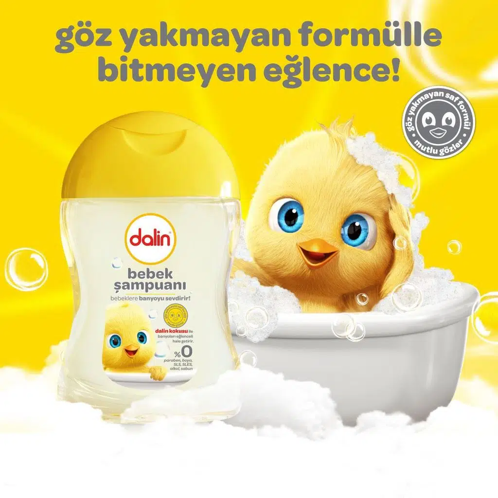Değişmeyen mis gibi kokulu dalin şampuan ile banyoları eğlenceli hale getirir. Göz yakmayan özel formülü sayesinde ilk günden itibaren bebeğinizin saç ve vücut temizliğinde güvenle kullanabilirsiniz.