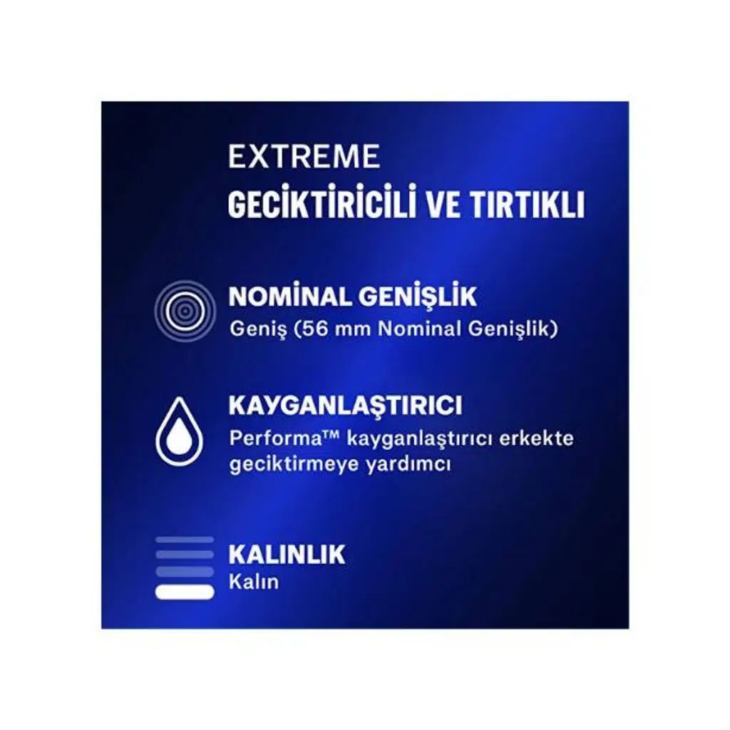 Durex Extreme, çiftler için tasarlanmış özel bir deneyim sunar. İç yüzeyindeki geciktirici krem (%5 benzokain) sayesinde erkeği yavaşlatırken, dış yüzeydeki tırtık ve noktalar kadını uyararak yoğun zevk sağlar. Standart (56 mm) genişliğiyle rahat bir kullanım sunar. Ekstra zevk için hem fiziksel hem duygusal uyumu hedefler.