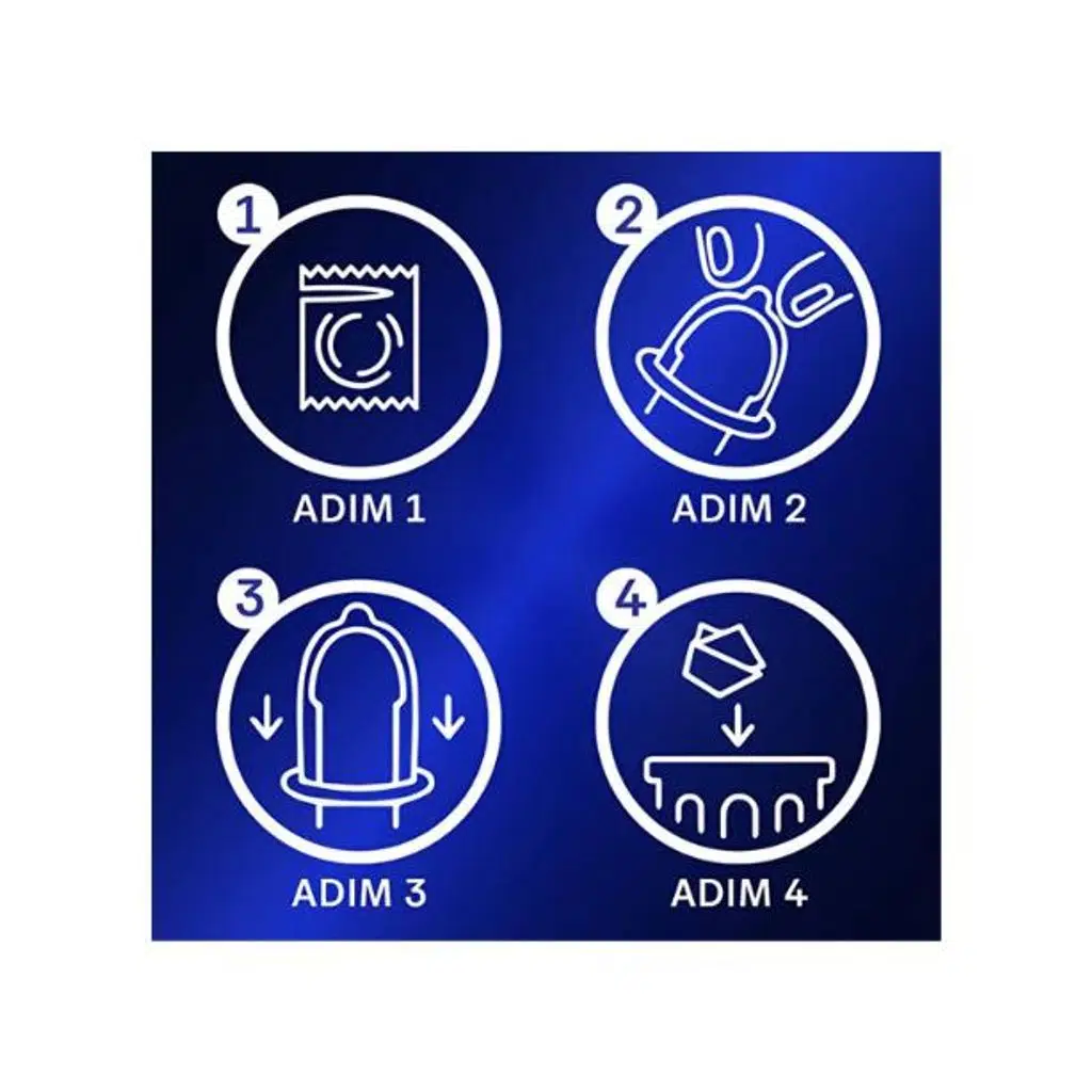 Keskin tırnak ve cisimlerden kaçınarak paketi dikkatlice açın. Yuvarlanmış halkanın dışta kaldığından emin olun. Prezervatifi, rezervuar ucunda hava kalmayacak şekilde penise takın.
