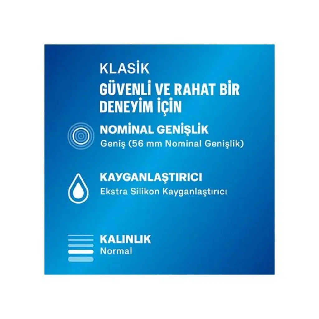 Durex Klasik, temel koruma sunan güvenilir ve sade tasarıma sahip prezervatif modelidir. Şeffaf, düz ve kayganlaştırıcılı yapısıyla konforlu bir deneyim sağlar.