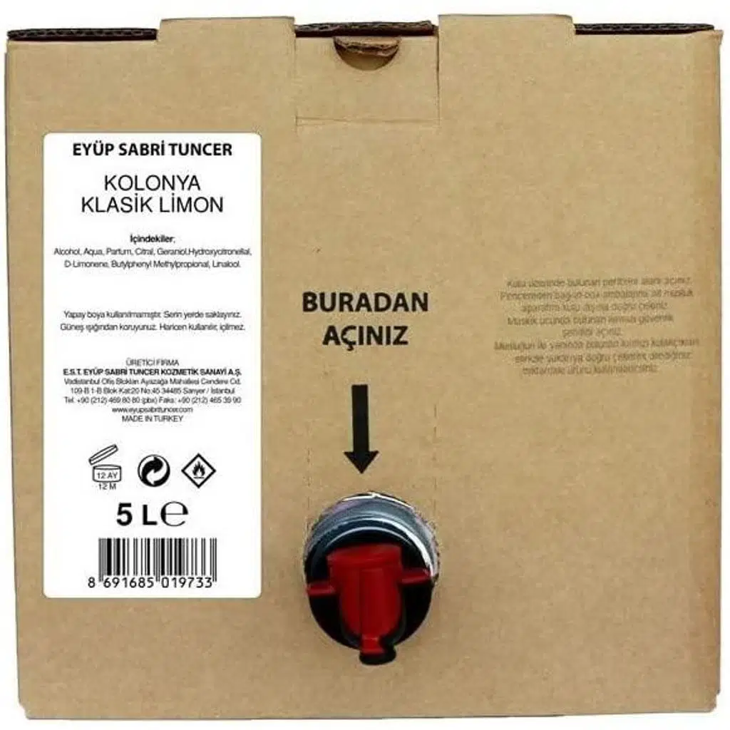 Eyüp Sabri Tuncer Klasik Limon Kolonyası 5 lt şimdi pratik, hijyenik ve ekonomik yeni ambalajında! Narenciye bahçelerinin taze iç açıcı kokularından özenle hazırlanmış, yüksek nitelikli bir kolonyadır. Ürünümüz 80 derece alkol içermektedir.Kullanım Ömrü:Kapak açıldıktan sonra 12 ay