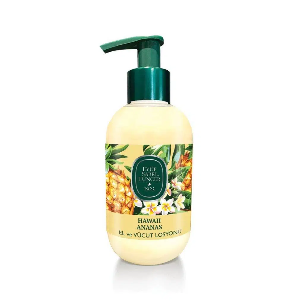Hawaii adalarının enerjisini barından etkileyici ananas kokusu ile mükemmel bir nemlendirici olan Eyüp Sabri Tuncer Hawaii Ananas Doğal Zeytinyağlı El ve Vücut Losyonu özel formülü sayesinde her cilt tipine uyum sağlar, mükemmel bir bakım uygular ve cildiniz tarafından hızla emilir. Doğaya saygılı, Ecocert sertifikalı aktif madde bileşimi cildin daha fazla nem tutmasını sağlar. Doğal zeytinyağlı içeriği ile cildinize yumuşaklık kazandırırken E Vitamini ile zenginleştirilen formülü hücreleri korur, onarır ve güçlendirir. İçeriğindeki ekstra nemlendiricilerle güneş sonrası kuruyan ve yıpranan cildinize tazelik katar.