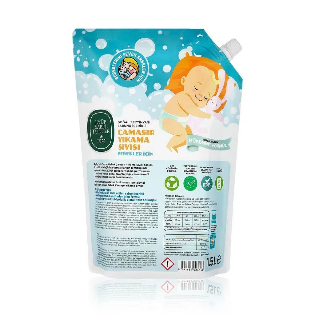Çamaşır Yıkama Sıvısı kategorisindeki ilk ürün olan Doğal Zeytinyağı Sabunu içerikli Bebek Çamaşır Sıvısının akredite laboratuvarlarda yapılan testlerle kalıntı bırakmadığı kanıtlanmıştır. Özenle hazırlanan formülü ile bebek giysilerinden su ile kolayca arınır. Hipoalerjenik formülünün yanı sıra bebeğinizin hassas cildinde tahrişe neden olabilecek; paraben, SLS, SLES, fosfat, ftalat, ağartıcı, silikon, boya ve alkol içermeyen Eyüp Sabri Tuncer Bebek Çamaşır Yıkama Sıvısı, doğal rahatlatıcı etkisi bulunan lavanta yağı, doğal zeytinyağı ve doğal bir mineral olan boraks içerikli özel formülü sayesinde anneler tarafından onaylıdır. Bebek giysilerinde oluşan süt, yağ, mama, çimen, kakao ve meyve lekelerine nüfuz ederek, etkin temizlik sağlar. Özel formülü sayesinde ilave yumuşatıcı kullanmanızı gerektirmez. Eyüp Sabri Tuncer Bebek Çamaşır Sıvısının hijyenik temizleme gücünü sizler de keşfedin.