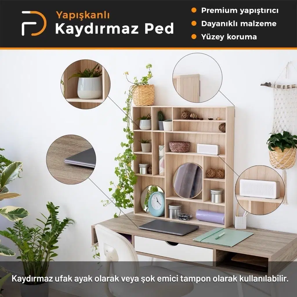 Furndiy Kendinden Yapışkanlı Yuvarlak Kaydırmaz Pedler, mobilyalarınızın ayaklarına yapışarak çizilmeyi ve gürültüyü en aza indirir. Yüksek kaliteli EVA malzemeden üretilmiş bu pedler, sürtünmeden kaynaklanan sesleri engellerken zemin yüzeyinizi korur. 20 mm çapında ve kendinden yapışkanlı bu pedler, sandalye, masa ve diğer mobilyalarınızın altında kolayca kullanılır. Mobilyalarınızı yerinde tutarken zemininizdeki çiziklerin önüne geçer, uzun süreli kullanım sağlar.