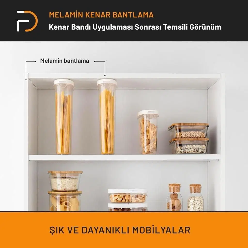 Furndiy Siyah Melamin Tutkallı Kenar Bandı, mobilya ve tezgahlarınızın görünümünü mükemmelleştirerek zarif ve estetik bir hava katar. Kendinden yapışkanlı yapısı sayesinde kullanım kolaylığı sunar ve güçlü yapışkanıyla farklı yüzeylere güvenilir bir şekilde yapışır. Ek yapıştırıcıya ihtiyaç duymadan zahmetsiz bir uygulama sağlar. Çok yönlü kullanım imkânı sunan bu kenar bandı, raflar, tahtalar, masalar ve dolaplar gibi çeşitli mobilya ve yüzeyler için idealdir.