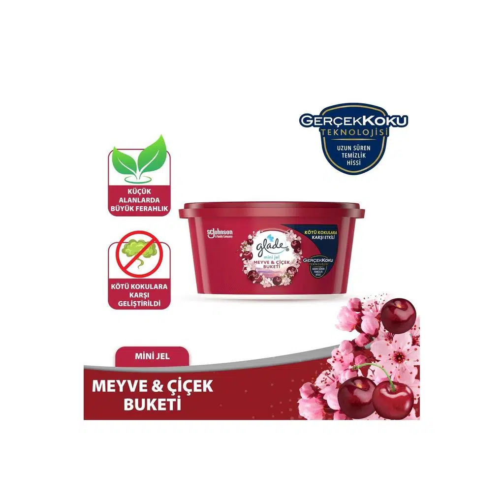 Glade Mini Jel Meyve ve Çiçek Buketi, meyve ve çiçeklerin benzersiz uyumunu evinizin küçük alanlarına taşıyan ferahlatıcı bir koku çözümüdür. Çekmece, dolap içi, kiler ve banyo gibi dar alanlar için tasarlanan bu jel, bulunduğu ortama uzun süreli tazelik katar. Meyve ve çiçek notalarının canlandırıcı etkisi ile ortamınıza canlılık ve hoş bir koku yayar. Ayarlanabilir koku seviyesi ile parfüm yoğunluğunu dilediğiniz gibi kontrol edebilir, küçük alanlarda büyük ferahlık yaratabilirsiniz.
