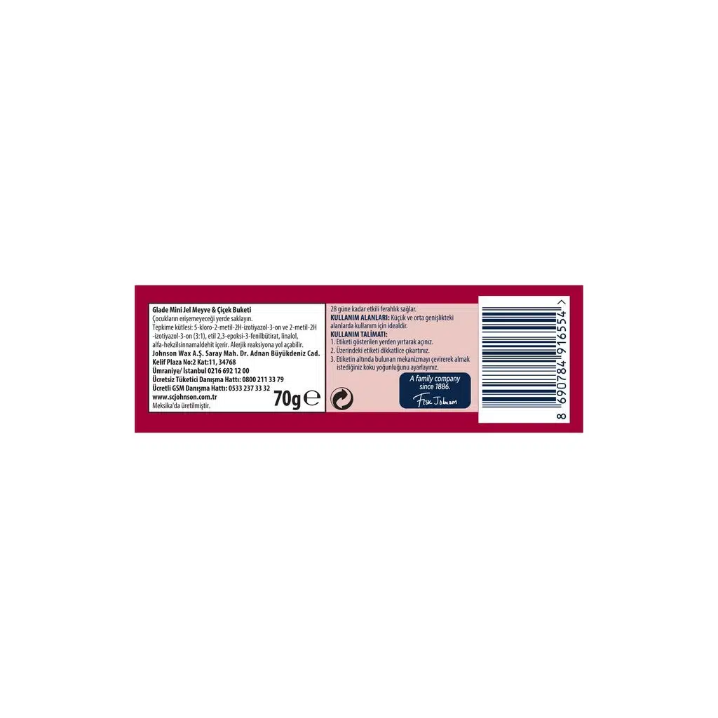 Kullanım Talimatı: Parfüm yoğunluğunu ayarlamak için üst kapağı çevirerek kaldırın veya indirin. Glade Mini Jel’i dilediğiniz küçük alana yerleştirin ve meyve ve çiçeklerin ferahlatıcı kokusunun keyfini çıkarın.