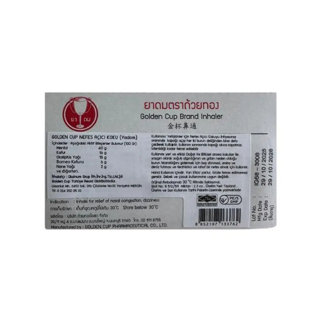 Golden Cup Nefes Açıcı Koku (Yadom), mentol ve bitkisel aromatik yağların ferahlatıcı etkisiyle burun tıkanıklığı hissinde ve baş dönmesi gibi durumlarda geçici rahatlama sağlamaya yardımcı olur. Klasik “Yadom” formu; gün içinde çantada, araçta ve seyahatte pratik kullanım için uygundur.