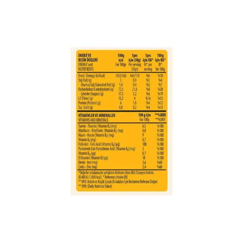 Vitaminler ve Mineraller: Tiamin (Vitamin B1), Riboflavin(Vitamin B2), Niasin (Vitamin B3), Vitamin B6, Folik Asit (Vitamin B9),Pantotenik Asit (Vitamin B5), Vitamin B12, Vitamin D, Demir, Çinko.