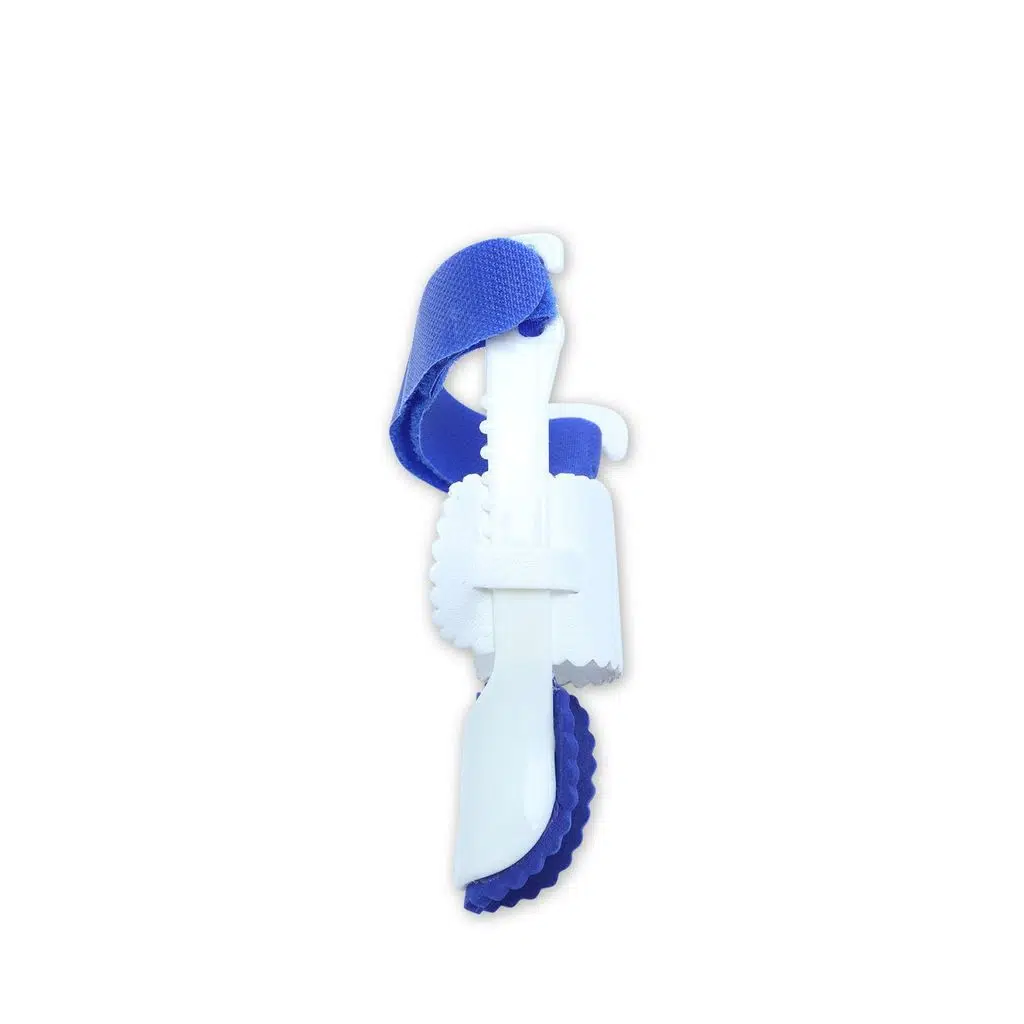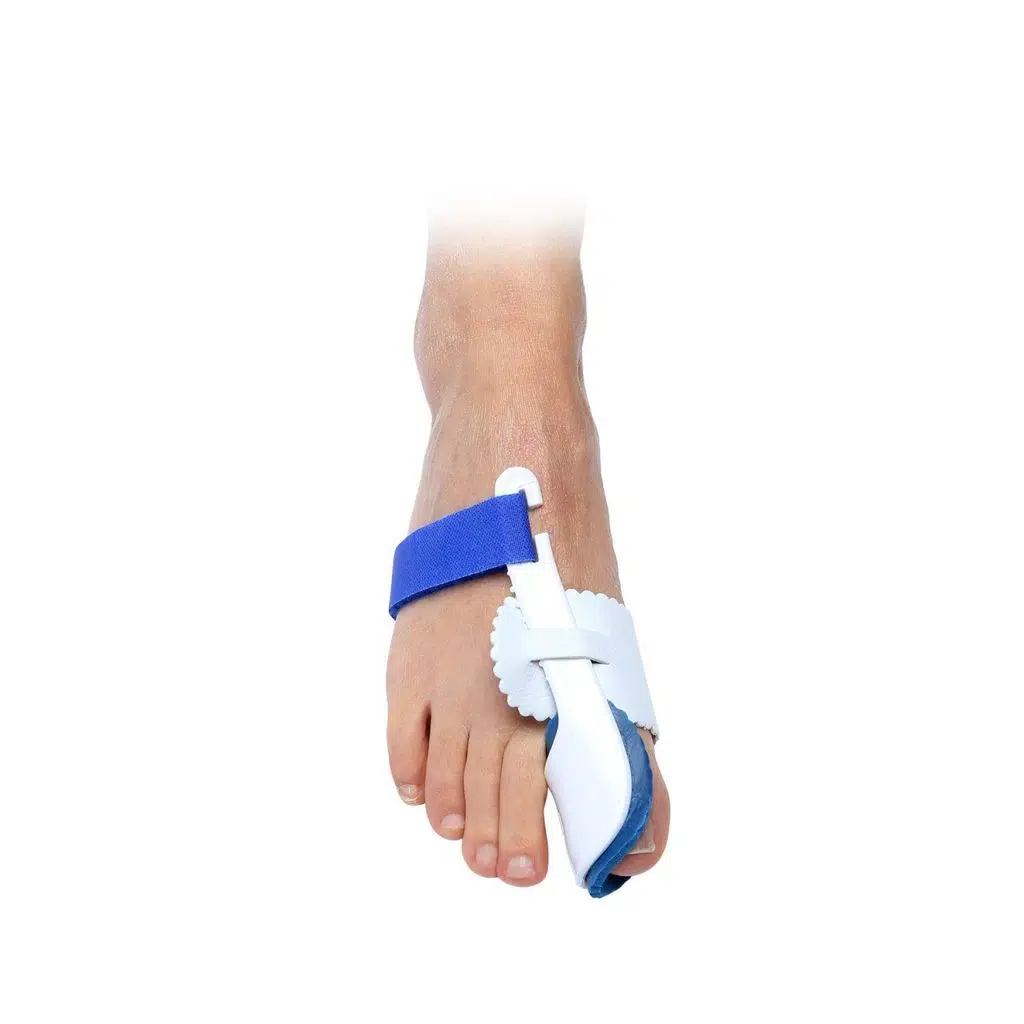 • Yanlış hizalanmış ayak başparmağını, yumuşak süngerli bir destek ile sabitleyerek ve bir velkro bant ile normal pozisyonuna doğru çekerek düzeltir.