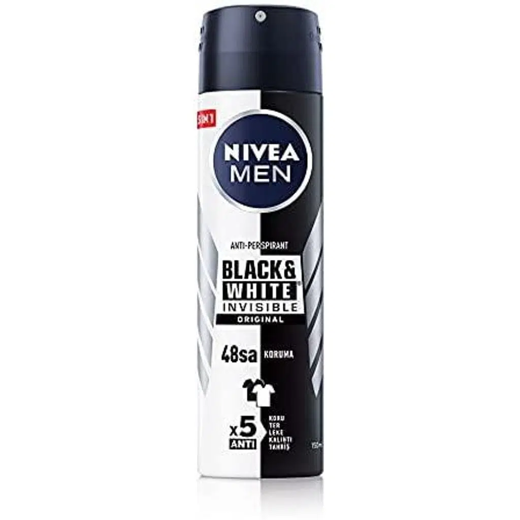 Türkiye'nin Lider Deodorantı Nivea Men Erkek Sprey Deodorant Black&White Invisible Original, koyu renkli giysilerde beyaz, açık renkli giysilerde sarı leke karşıtıdır. Siyahlar siyah, beyazlar daha uzun süre beyaz kalır Cildinize önem veren 48 saate kadar etkili anti -perspirant koruması sağlar. Ciltle uyumu dermatolojik olarak onaylanmıştır. Pudralı ve alkolsüzdür.Boya maddesi içermez. Nasıl Kullanılır: Kutuyu dik tutarak 15cm mesafeden çıplak ve temiz koltuk altına püskürtün. Ürün koltuk altına uyguladıktan sonra tamamen kurumasını bekleyin.