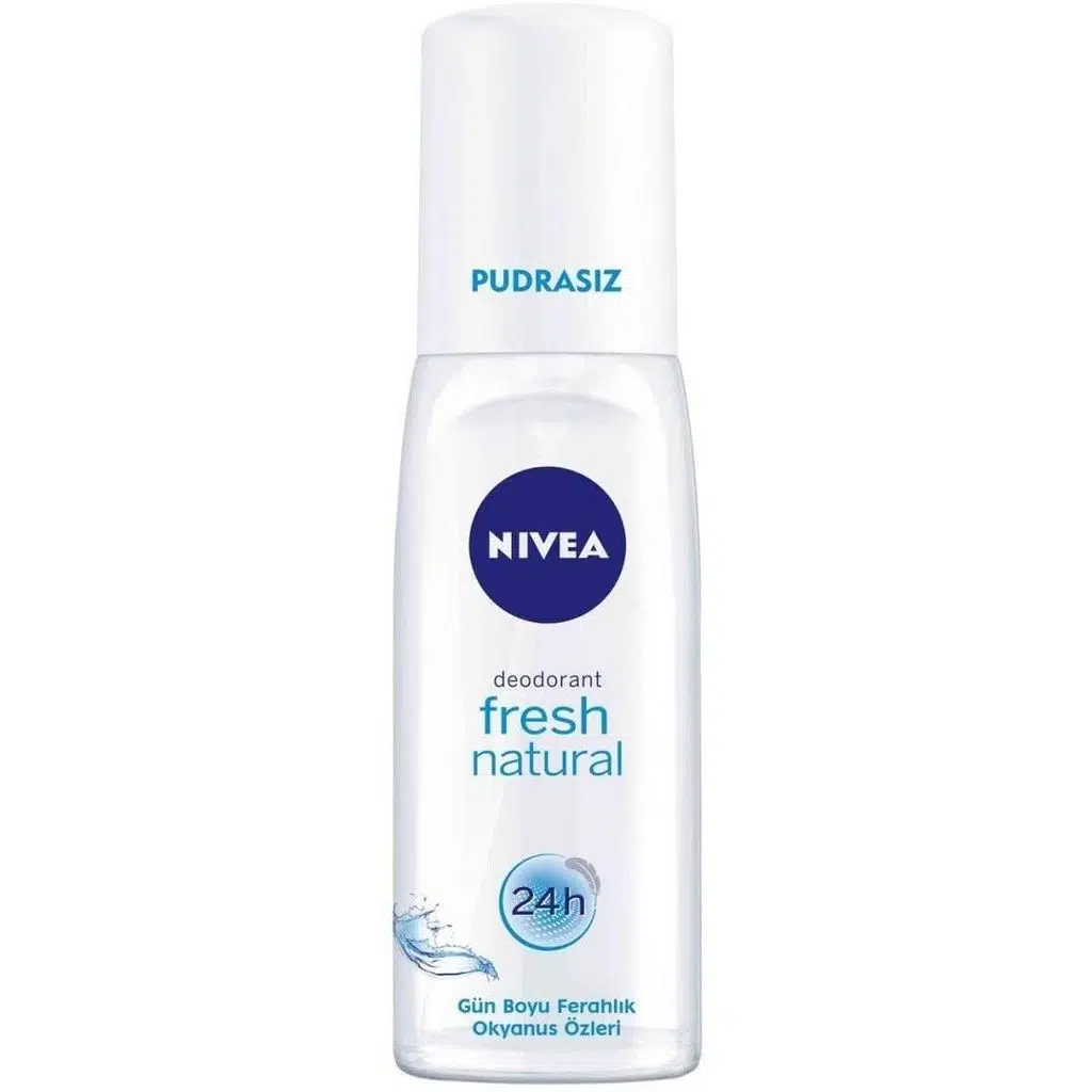 Türkiye'nin Lider Deodorantı Nivea Kadın Pump Sprey Deodorant Fresh Natural, okyanus özleri içeren formülü ile gün boyu süren ferahlık hissi verir Cildinize önem veren 48 saate kadar etkili deodorant koruması sağlar. Özellikle aerosol spreylerin içeriğinde bulunan sıkıştırılmış gazlardan rahatsız olan kullanıcılar için idealdir. Gün boyu güvenilir koruma ve doğal tazelik sağlar Ciltle uyumu dermatolojik olarak kanıtlanmıştır.