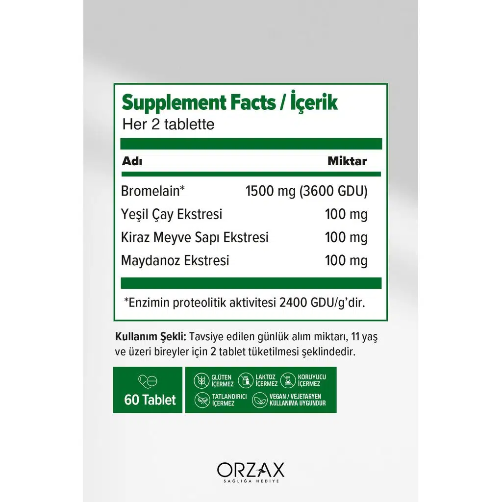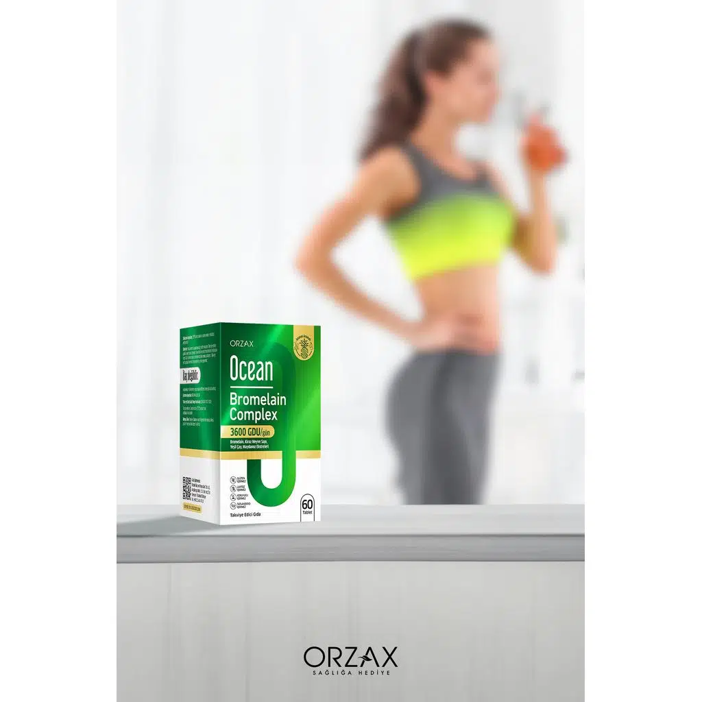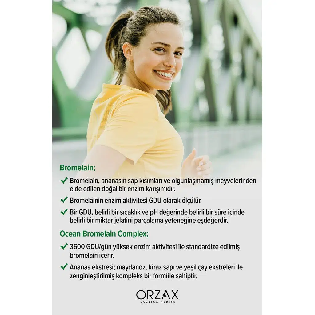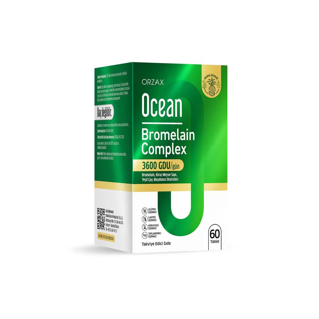 Ocean Bromelain Complex, her 2 tablette 1500 mg bromelain içerir ve 3600 GDU/g etkinliğe sahiptir. Aynı zamanda yeşil çay ekstresi, kiraz meyve sapı ekstresi ve maydanoz ekstresi ile zenginleştirilmiş bir içeriğe sahiptir. 60 tablet içerir.