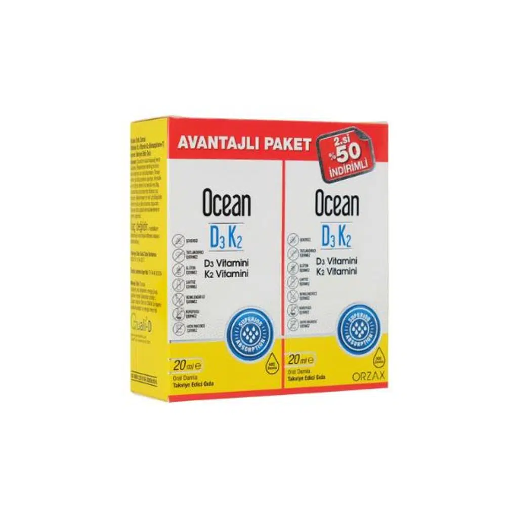Ocean D3 + K2 Vitamin Damla, günlük D vitamini ve K vitamini ihtiyacını karşılamaya yardımcı olacak şekilde formüle edilmiştir. Damla formuyla pratik kullanım sunar. İçeriğinde koruyucu, tatlandırıcı, renklendirici veya yapay aroma bulunmaz. Taşıyıcı yağ olarak hakiki zeytinyağı kullanılmıştır.