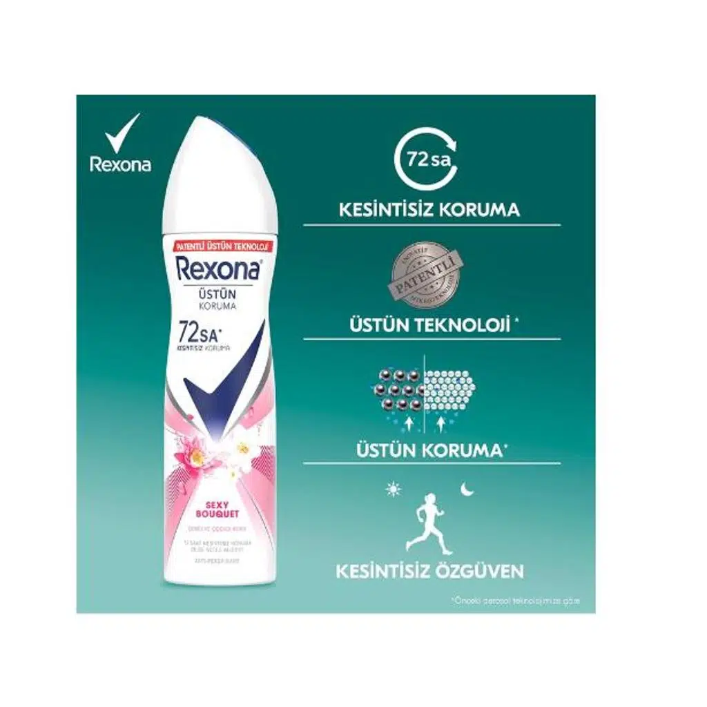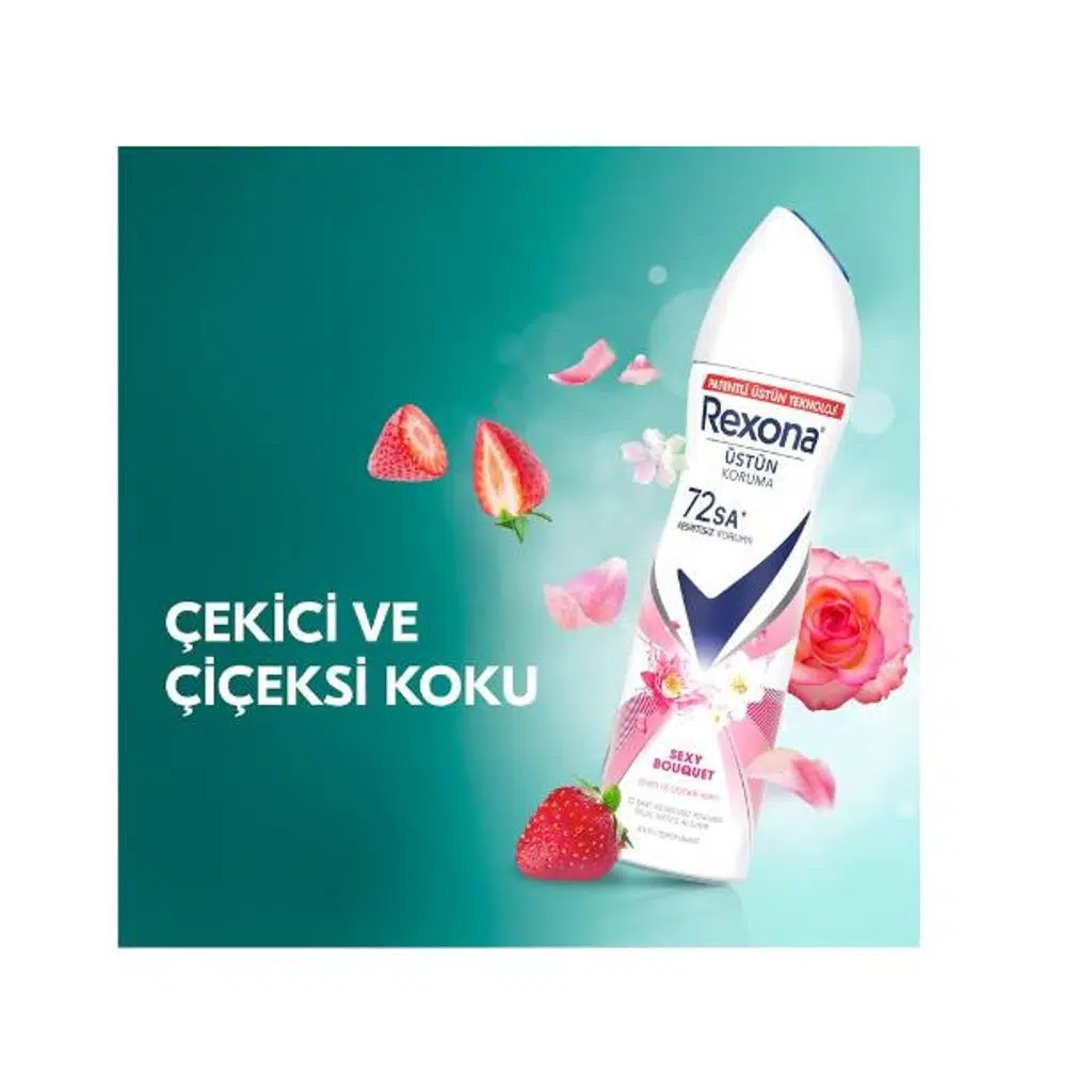 Hareketli günlerinde dahi ferahlıktan ödün vermek istemeyenler için tasarlanan Rexona Sexy Bouquet, çekici ve çiçeksi kokusuyla 72 saat boyunca ter kokusu ve ıslaklık kontrolü sunar. Antiperspirant özelliğiyle donatılan bu sprey deodorant, harekete duyarlı mikro kapsül teknolojisi sayesinde her adımda hoş kokusunu serbest bırakır.