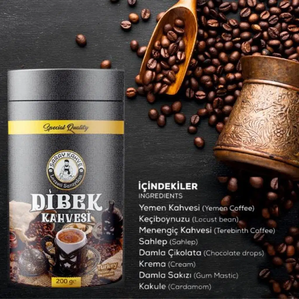 Saray Kahve Dibek Kahvesi; Yemen kahvesi, menengiç ve keçiboynuzu harmanını sahlep dokusu, damla sakız ve kakule aromasıyla tamamlar. Geleneksel dibek kahvesi tarzında yumuşak içimli, yoğun kokulu ve bol köpüklü bir fincan keyfi sunar.
