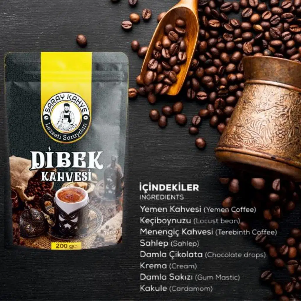 Saray Kahve Dibek Kahvesi; Yemen kahvesi, menengiç ve keçiboynuzu harmanını sahlep dokusu, damla sakız ve kakule aromasıyla tamamlar. Geleneksel dibek kahvesi tarzında yumuşak içimli, yoğun kokulu ve bol köpüklü bir fincan keyfi sunar.