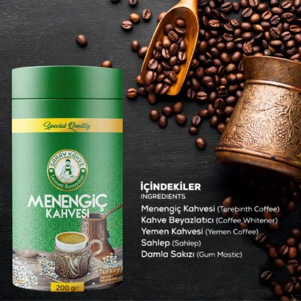 Saray Kahve Menengiç Kahvesi; menengiç kahvesinin kendine özgü aromasıyla kahve beyazlatıcıyı bir araya getirir. Yemen kahvesi, sahlep ve damla sakız dokunuşuyla daha yumuşak içimli, kremamsı ve yoğun kokulu bir kahve keyfi sunar.