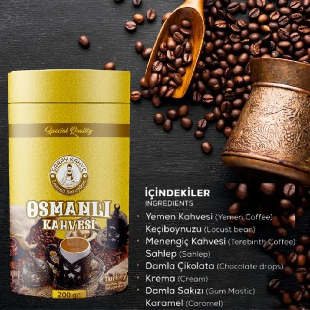 Saray Kahve Osmanlı Kahvesi; Yemen kahvesi, menengiç ve keçiboynuzu harmanını sahlep dokusu, çikolata damlaları ve krema ile zenginleştirir. Damla sakız ve karamel aromasıyla yumuşak içimli, yoğun kokulu ve keyifli bir fincan deneyimi sunar.