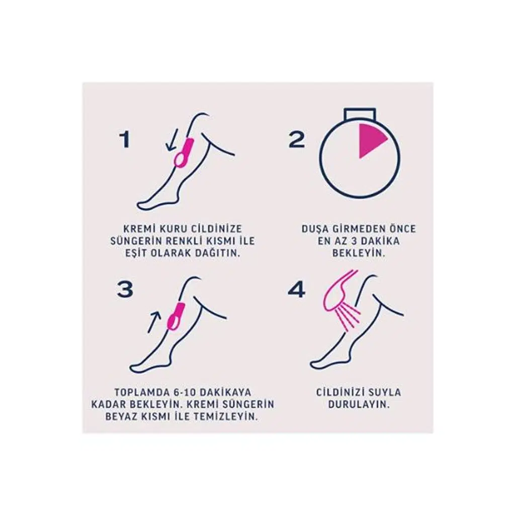 Duşa girmeden önce kremi spatula yardımıyla tüyleri kaplayacak şekilde uygulayın. En az 1 dakika bekleyin, ardından duşunuzu her zamanki gibi alın. Krem 3-6 dakika içinde etkisini gösterir. Sonrasında spatula ile temizleyin ve suyla durulayın.