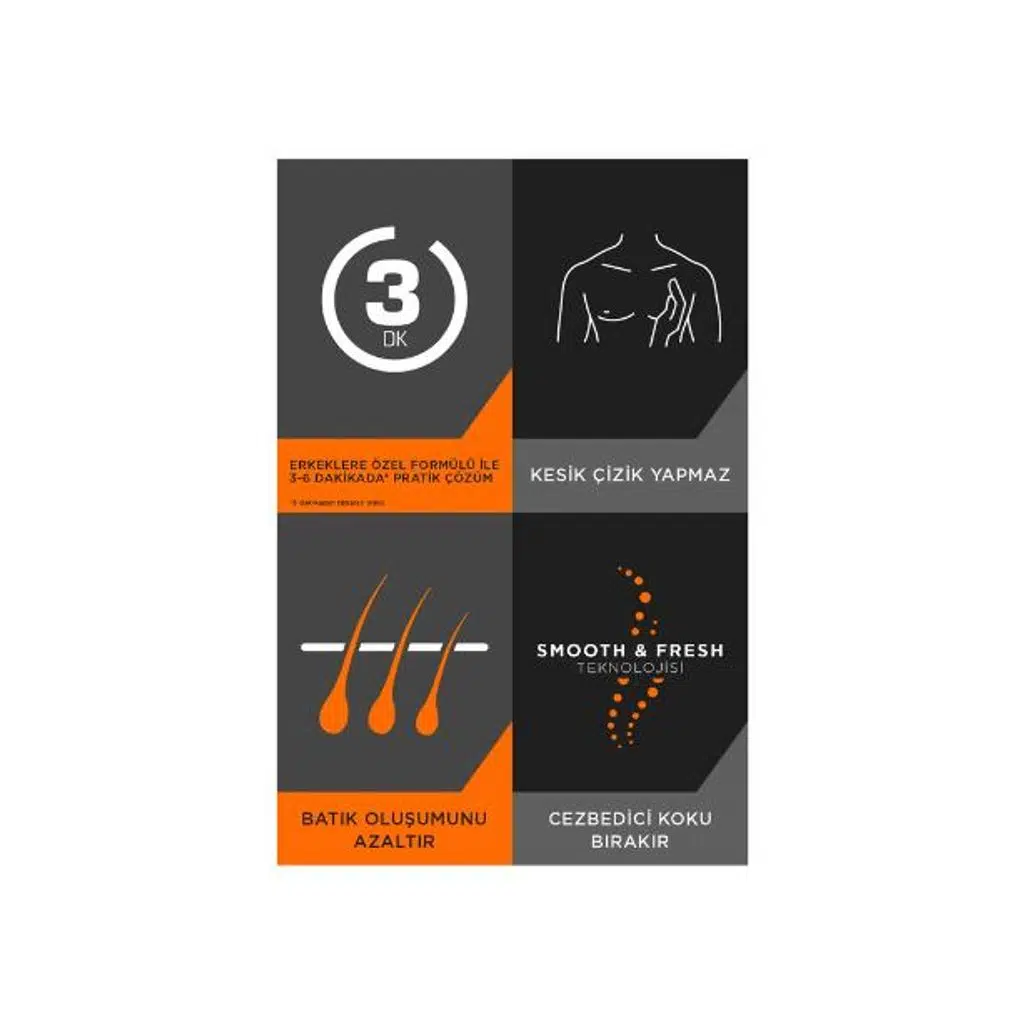 Hassas ciltler için özel olarak geliştirilen Veet Men Tüy Dökücü Krem, 5 ila 10 dakika içinde etkili sonuç sunar. Sırt, göğüs, kollar, bacaklar ve koltuk altlarında güvenle kullanılabilir. Smooth & Fresh koku teknolojisi sayesinde kötü koku bırakmaz, cildi 24 saate kadar nemli tutar. Tıkanma ve tahriş riskini azaltan formülüyle erkek cildi için idealdir.