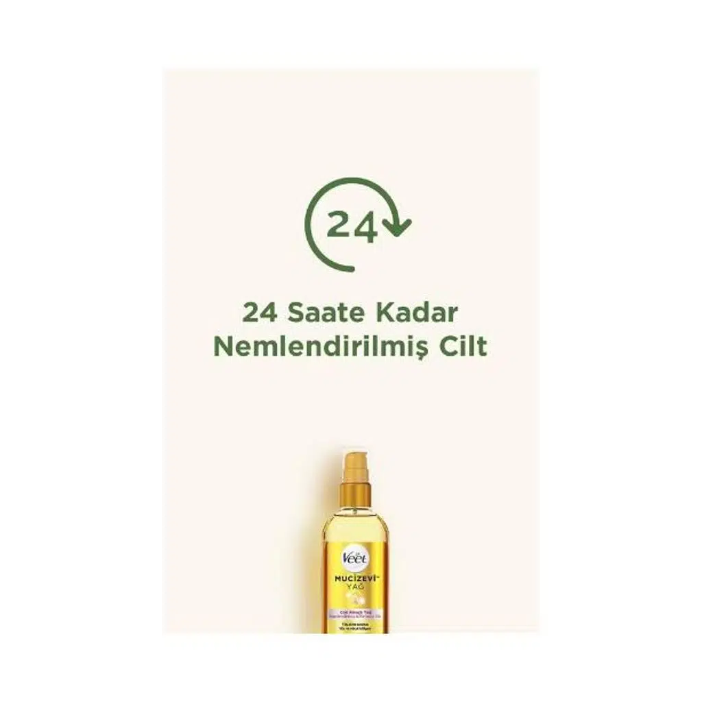 %100 doğal yağ özleri, vitaminler ve Omega 3 ile zenginleştirilmiş Veet Mucizevi Yağ, cildin 24 saate kadar yumuşak ve nemli kalmasına yardımcı olur. Yüz ve vücut bölgelerinde kullanım için uygundur. Hafif ve besleyici dokusuyla ciltte yağlı his bırakmaz. Tüm cilt tiplerinde güvenle kullanılabilir, dermatolojik olarak test edilmiştir.
