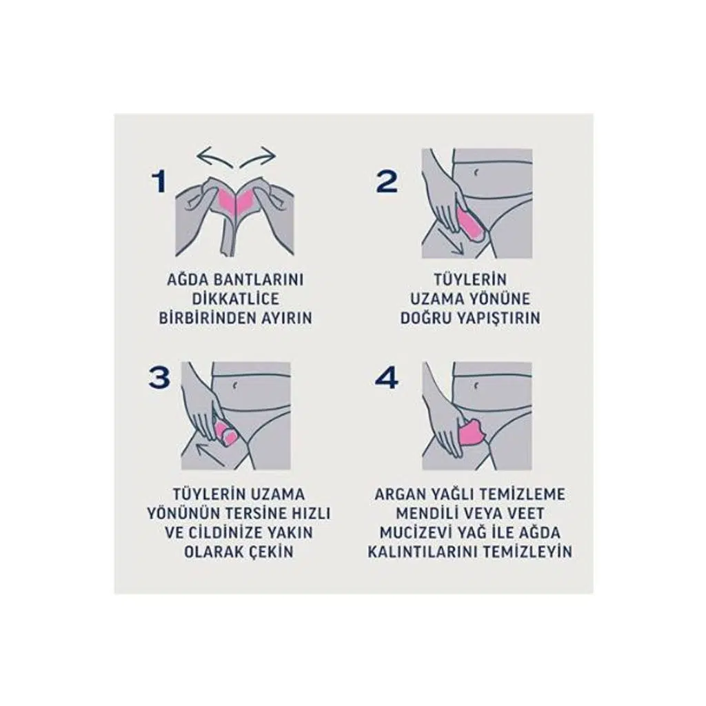 Ağda bandını avuç içinde 5 saniye ovuşturarak ısıtın. Yavaşça ayırıp tüylerin çıkış yönüne yapıştırın. Cildi gergin tutarak bandı tek hamlede tüylerin çıkış yönünün tersine çekin. Aynı bölgeye birden fazla uygulama yapılması önerilmez.