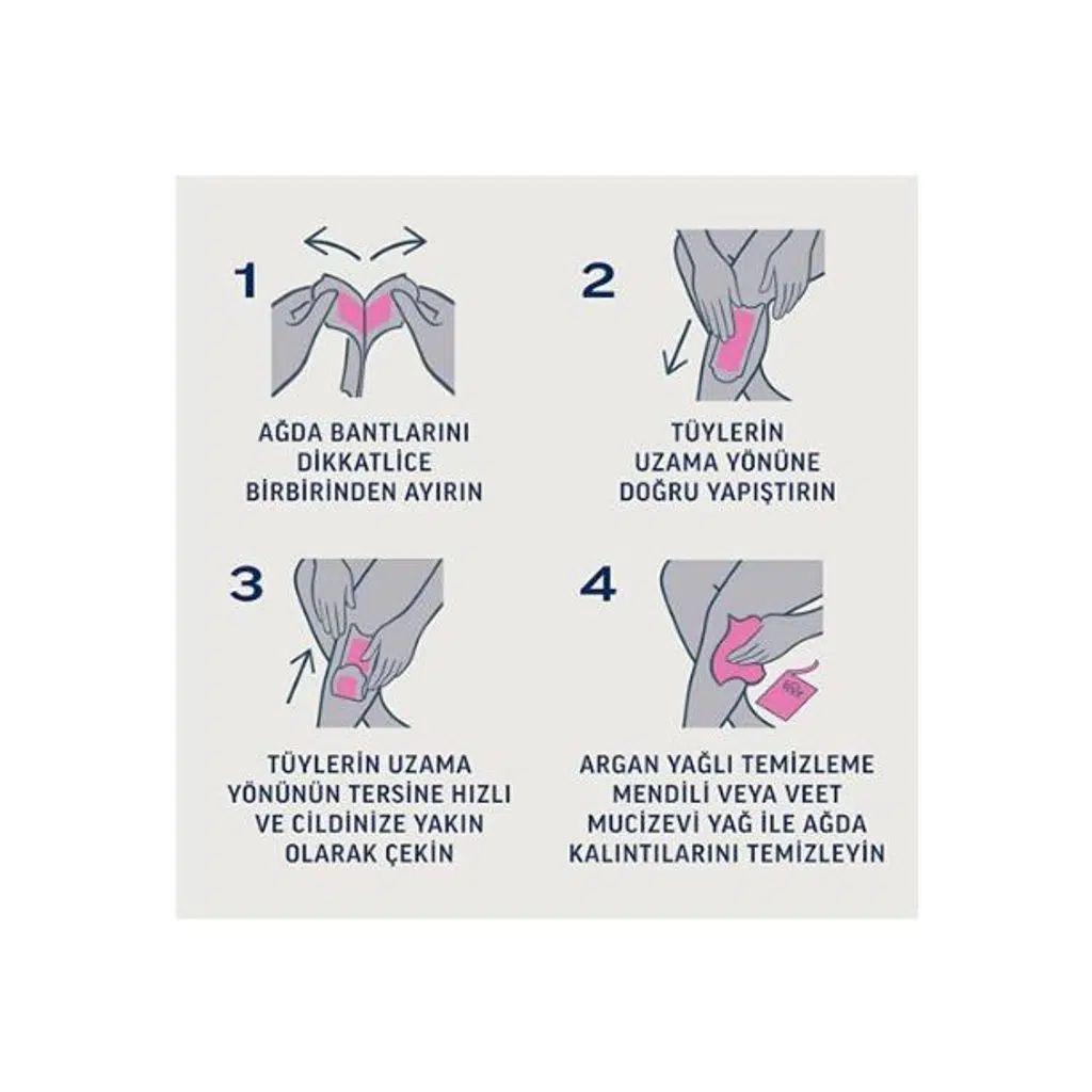 Ağda bandını avuç içinde 5 saniye ısıtarak yavaşça ayırın. Tüylerin çıkış yönüne doğru cilde yapıştırın. Cildi gergin tutarak, tüylerin çıkış yönünün tersine tek hamlede çekin. Aynı bandı yapışma özelliği bitene kadar tekrar kullanabilirsiniz.