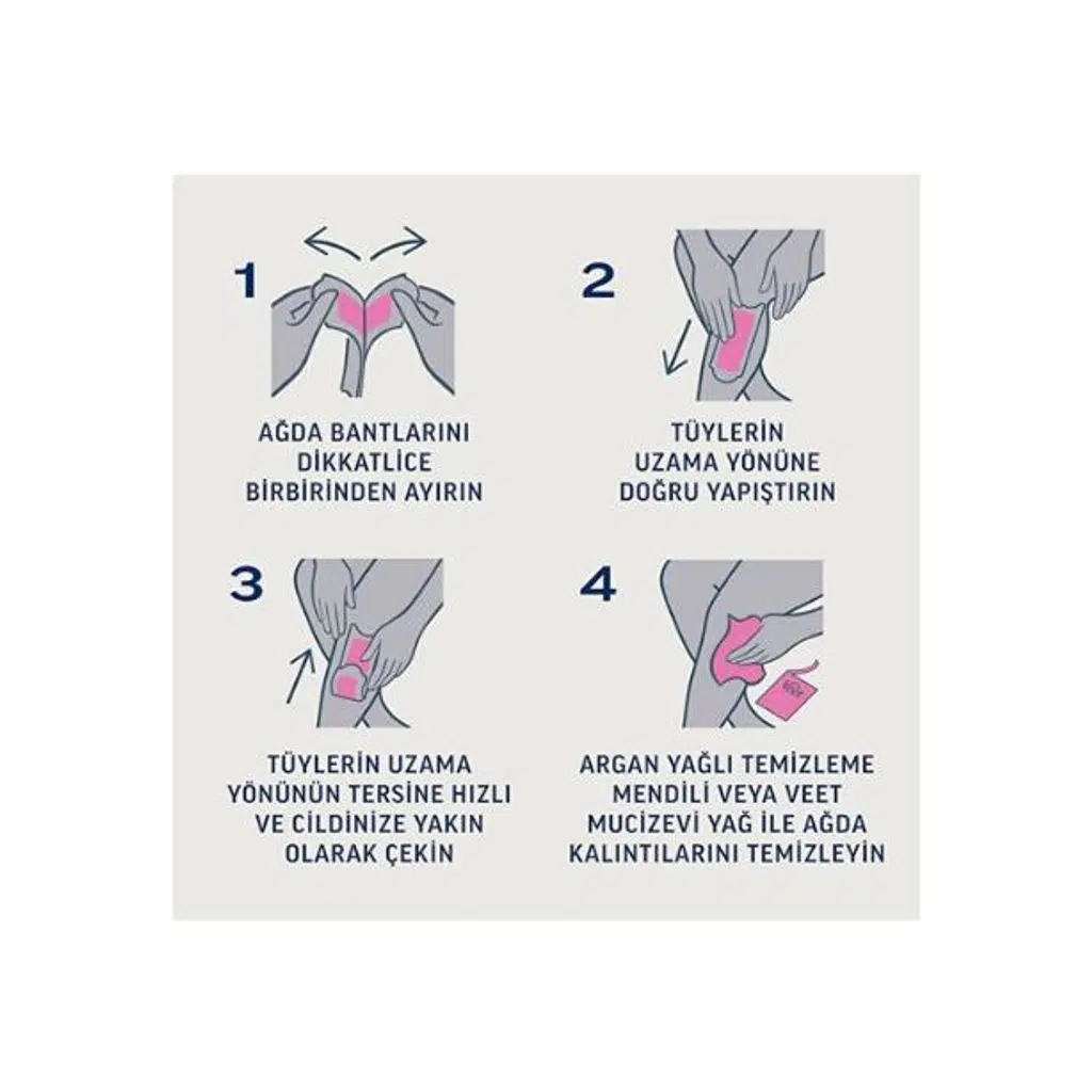 Bandı avuç içinde hafifçe ısıtın ve dikkatlice ayırın. Tüylerin çıkış yönüne doğru yapıştırın, birkaç kez bastırarak yapışmasını sağlayın. Cildi gergin tutarak bandı ters yöne hızlıca çekin. Kalıntıları temizleme mendiliyle silebilirsiniz.