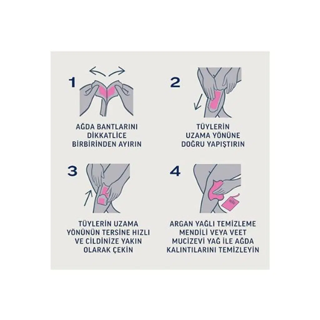 Bandı avuç içinde hafifçe ısıtarak ayırın. Tüylerin çıkış yönüne yapıştırın, birkaç kez bastırın. Cildi gergin tutarak bandı tüylerin çıkış yönünün tersine, hızlı ve tek hamlede çekin. Kalan kalıntılar temizleme mendiliyle silinebilir.