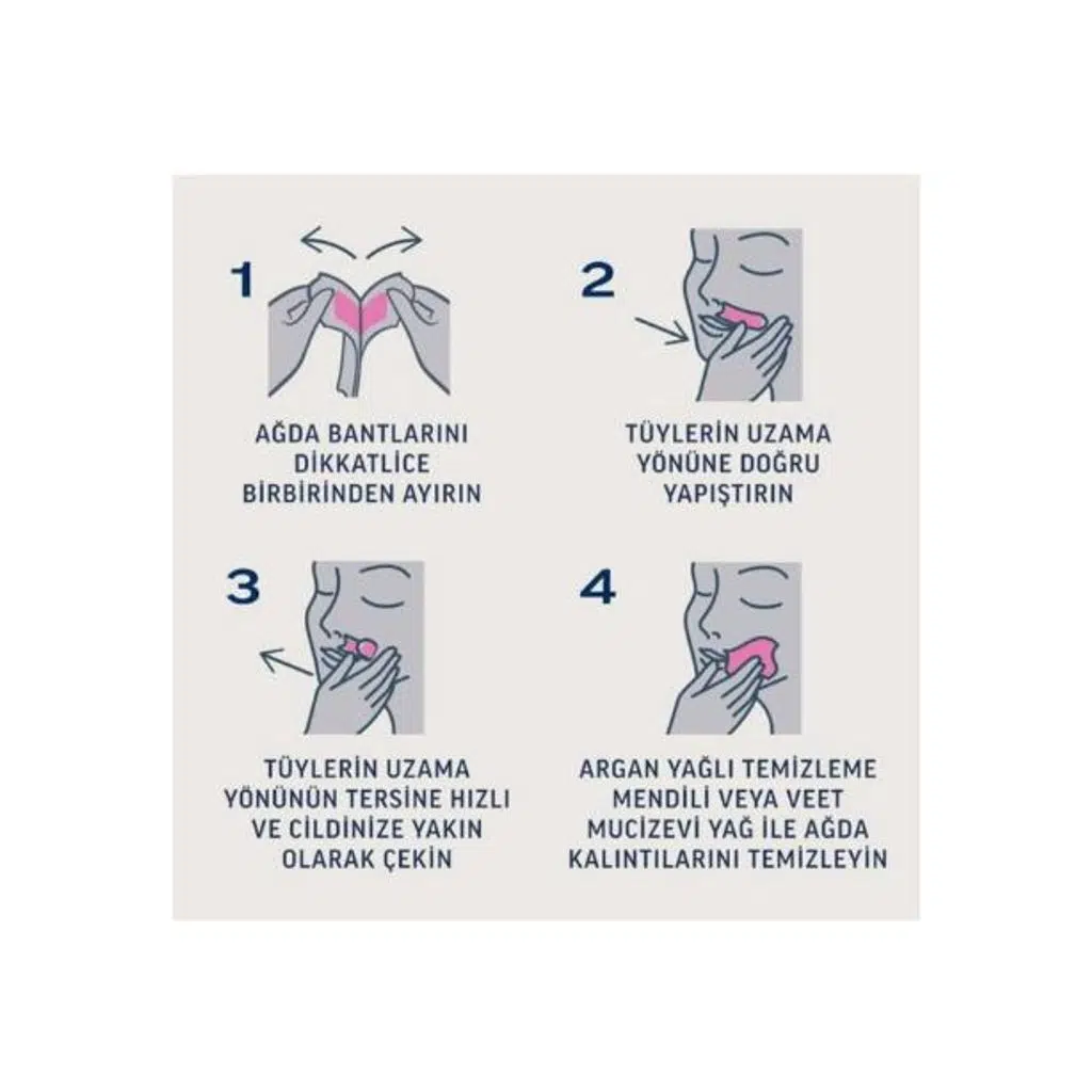 Ağda bantlarını yuvarlak kavrama ucundan tutarak ayırın. Bandı tüylerin çıkış yönüne yapıştırın, birkaç kez bastırarak iyice yapışmasını sağlayın. Cildi gergin tutarak bandı ters yöne, hızlı ve tek seferde çekin. Kalan kalıntıları temizleme mendili ya da Veet Mucizevi Yağ ile silin.