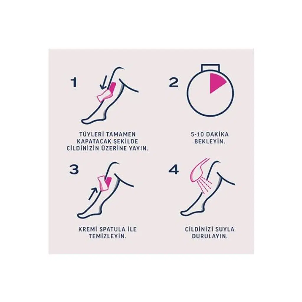 Kremi spatula yardımıyla tüyleri tamamen kapatacak şekilde uygulayın. 2 dakika sonra küçük bir alanı test edin. Tüyler kolayca çıkıyorsa kalan bölgeyi temizleyin. Gerekirse toplamda 6 dakikayı geçmeyecek şekilde bekletin. Uygulama sonrası cildi suyla durulayıp kurulayın.