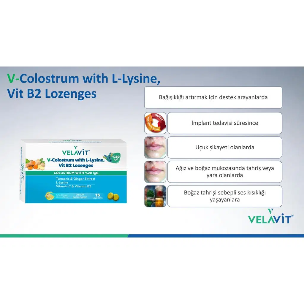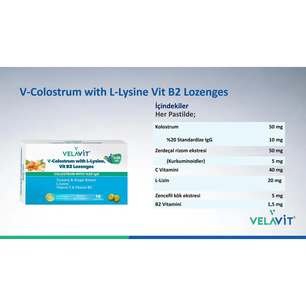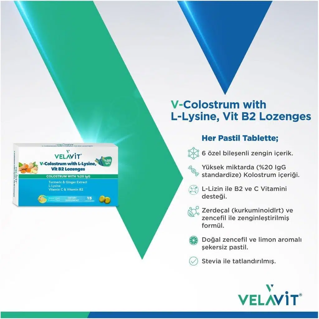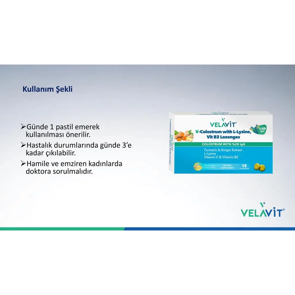 | Etiketler | Velavit V- Colostrum with L-Lysine Vitamin B2 Lozanges Pastil 15 li |